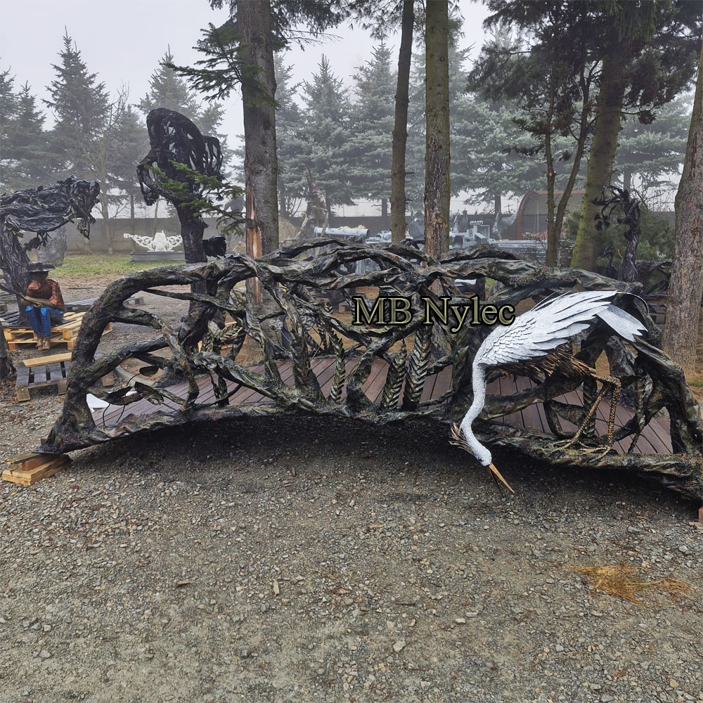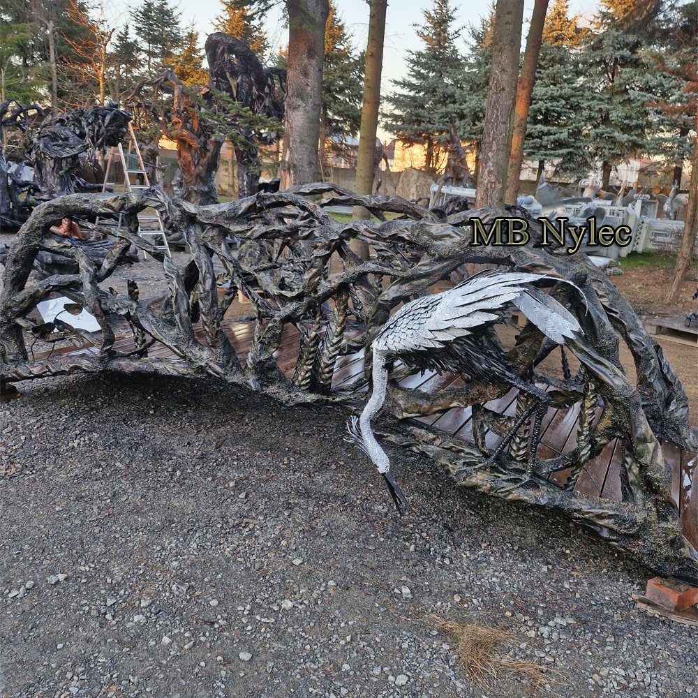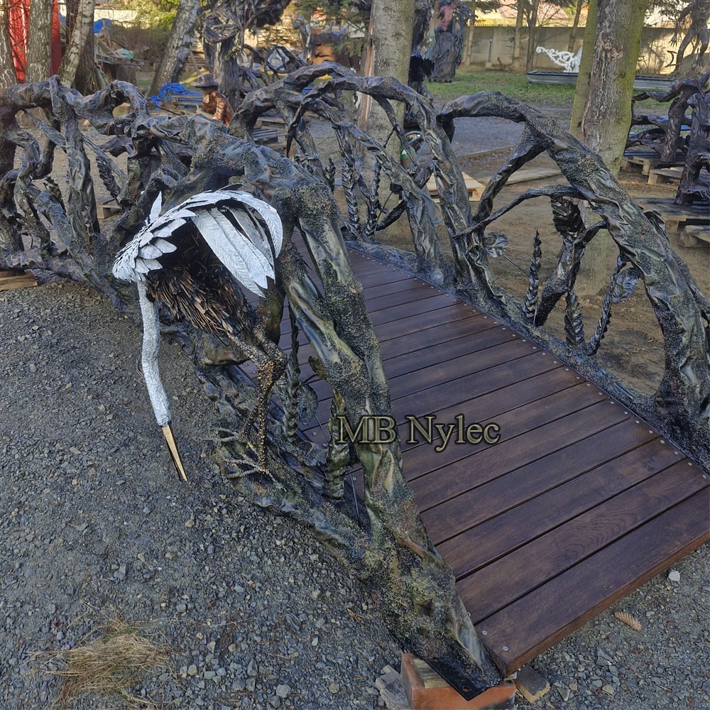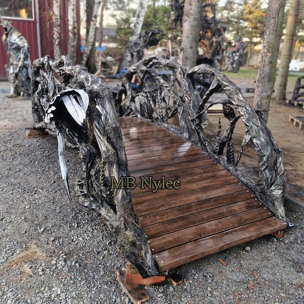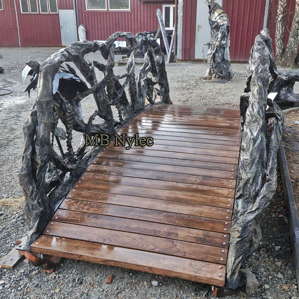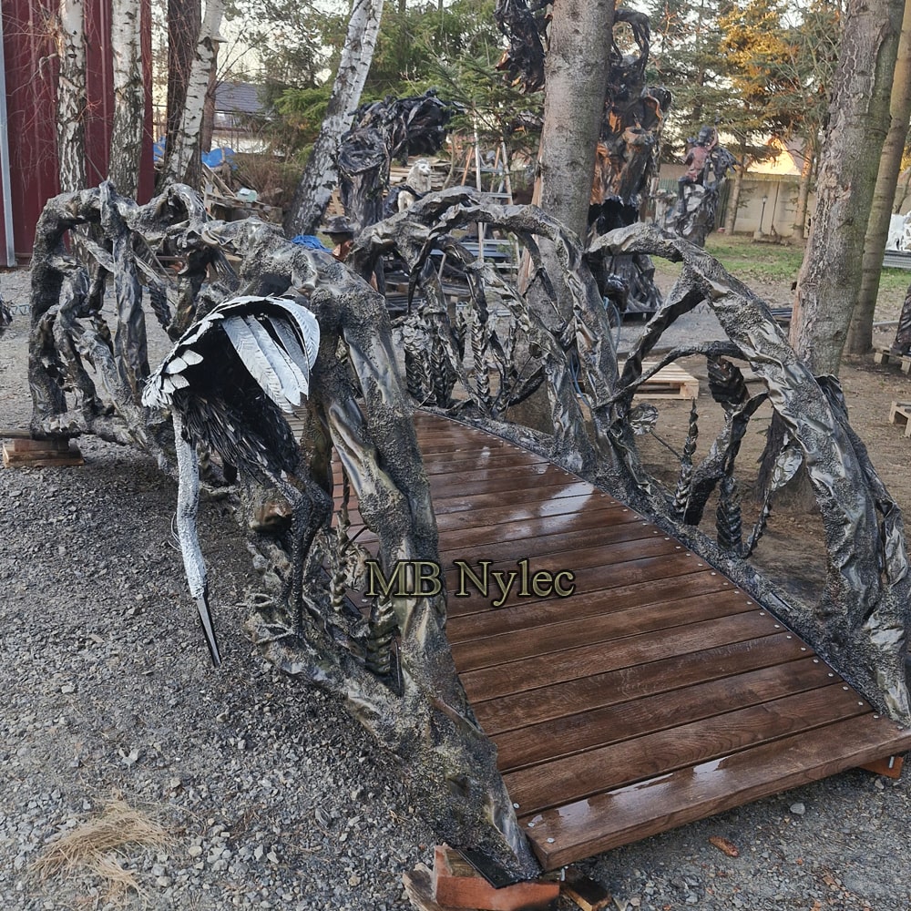 Ta realizacja stanowi przykład balustrady artystycznej zaprojektowanej jako integralna część mostku ogrodowego. Forma nie została tu potraktowana jako zwykłe zabezpieczenie, lecz jako element kompozycyjny współtworzący przestrzeń ogrodu. Linie prowadzone są swobodnie i organicznie, dzięki czemu balustrada harmonijnie łączy się z zielenią, wodą i stalowo-drewnianą konstrukcją mostku.