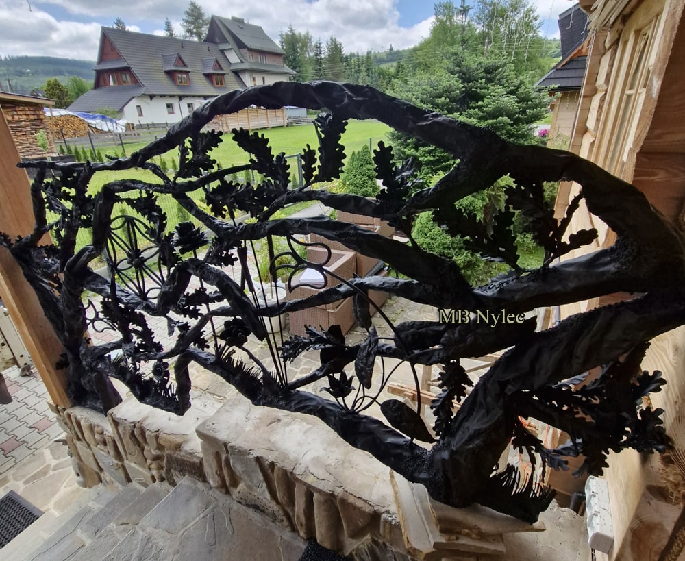 Balustrada została wykonana w całości ręcznie ze stali w naszej kuźni, w oparciu o tradycyjne kowalstwo artystyczne oraz technik metaloplastyki, w których stal modelowana jest indywidualnie i przestrzennie. Każdy element powstaje bez użycia gotowych wzorów czy prefabrykatów. Nieregularność linii, zróżnicowana grubość detali oraz świadomie budowana głębia formy nadają konstrukcji wyraźnie rzeźbiarski charakter.