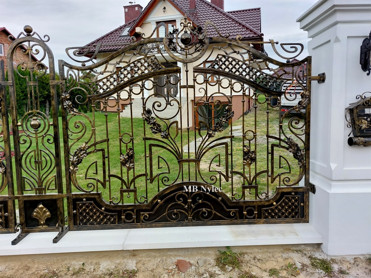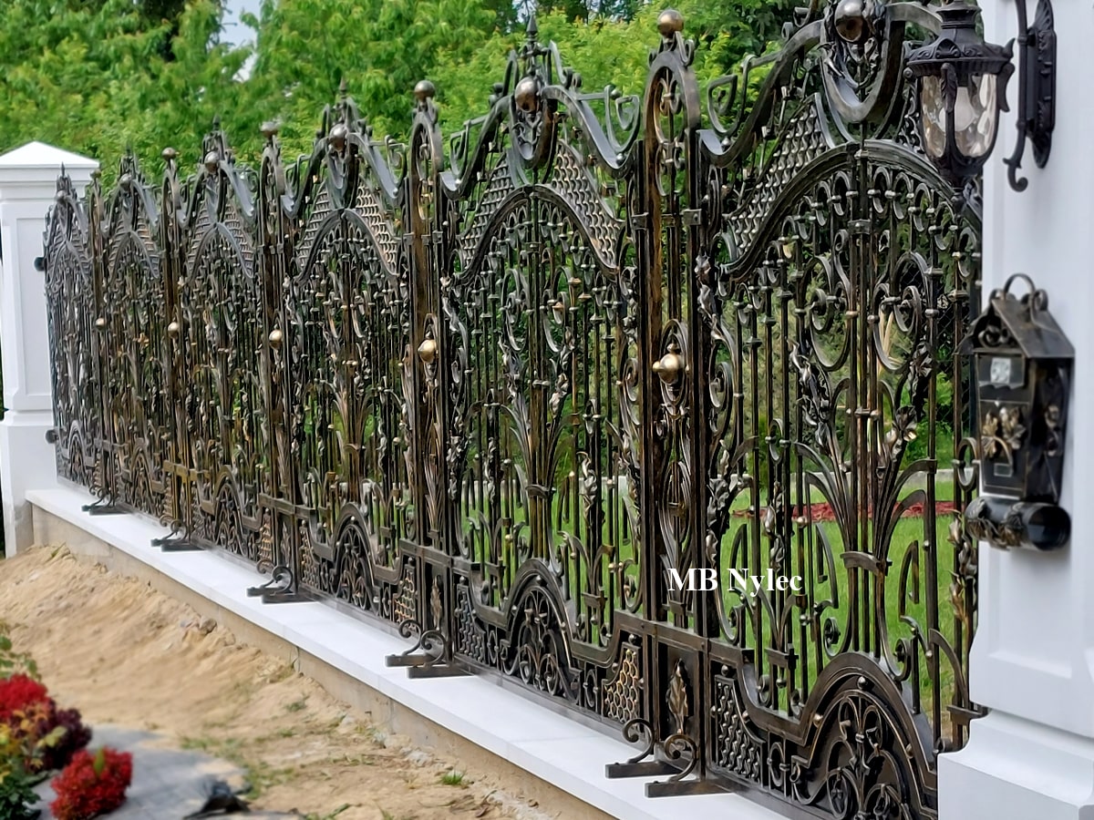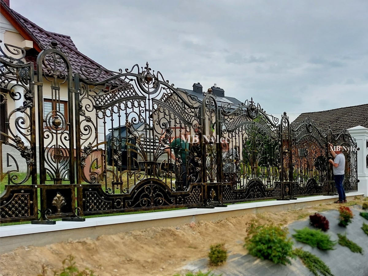 Wyjątkowe, bardzo bogato zdobione kute ogrodzenie wykonane w technice bezprzęsłowej – ogrodzenie jest jednym ciągiem a słupy betonowe znajdują się tylko na jego początku oraz końcu. Dzięki takiemu rozwiązaniu ogrodzenie takie wygląda bardzo efektownie i harmonijnie.