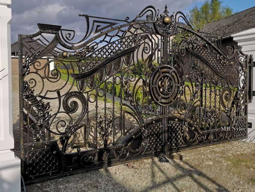 Brama dwuskrzydłowa BP 182 znajdzie zastosowanie w otoczeniu zarówno klasycznej, jak również modernistycznej architektury. Oryginalne wzornictwo inspirowane motywami fantastycznymi to gwarancja, że brama będzie przyciągać wzrok przechodniów, a zarazem będzie pozytywną wizytówką całej posesji. Metalowe skrzydła bramy można osadzić w wysokich bloczkach betonowych, jednakże pasuje zarówno do ogrodzeń murowanych, jak również metalowych. W tle przepięknie prezentować się będzie finezyjny podjazd oraz rośliny zachwycające oryginalnym wyglądem. Kuta brama BP 182 o fantastycznym zacięciu to doskonały wybór dla każdego indywidualisty oczekującego najwyższej jakości wykonania oraz trwałości na przestrzeni wielu lat.