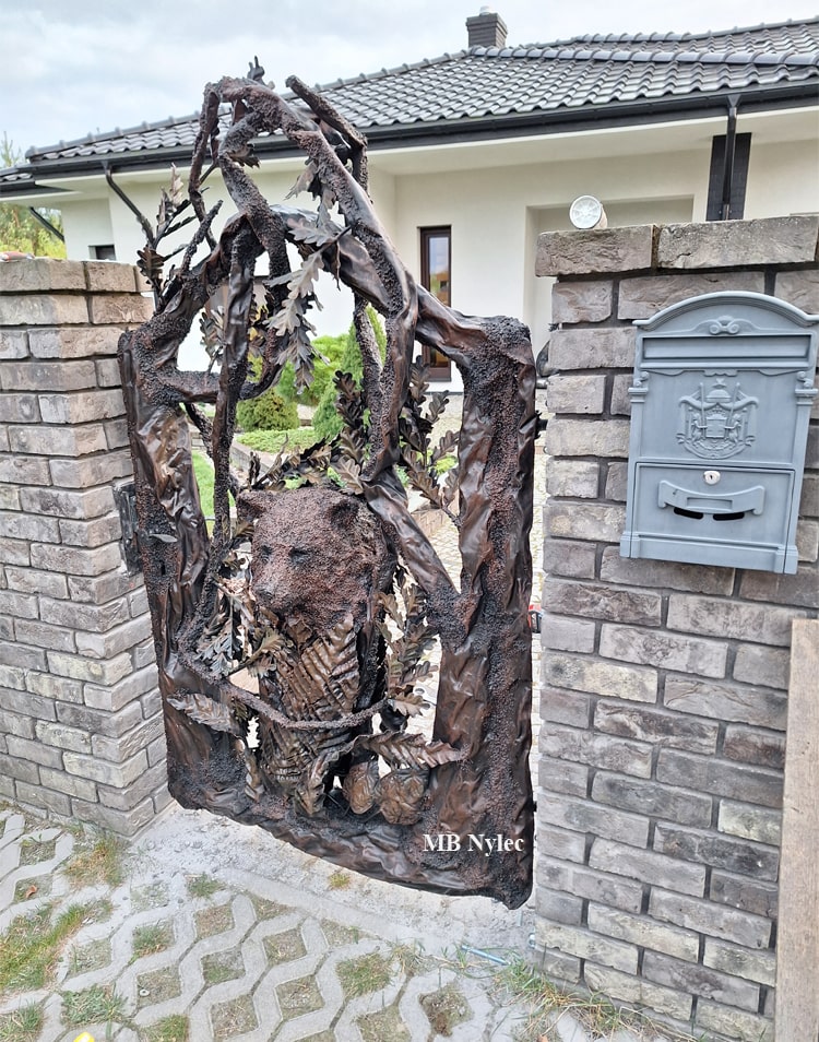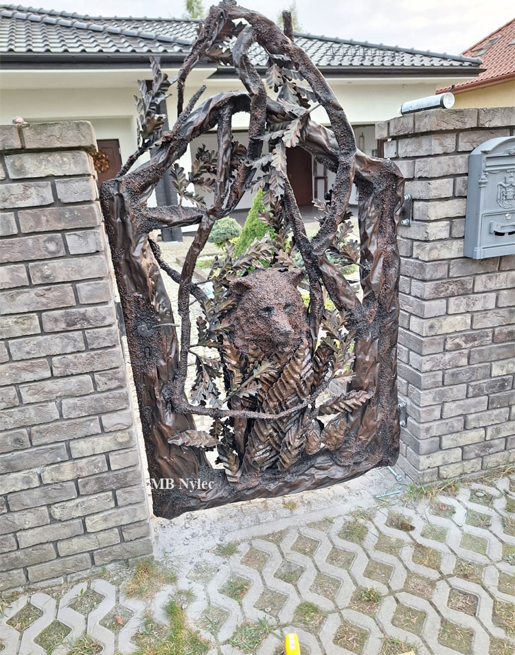 Bardzo ciekawa furtka będąca dopełnieniem wykonywanych przez nas bram myśliwskich. Furtka wykonana w formie przestrzennego drzewa oraz innej roślinności z pośród której wystaje głowa niedźwiadka spoglądającego na każdego go przechodzi w pobliżu. Całość wykonana wyłącznie ze stali, ocynkowana ogniowo. Możemy wykonać również taką furtkę bez głowy niedźwiadka lub z dowolnym innym motywem.