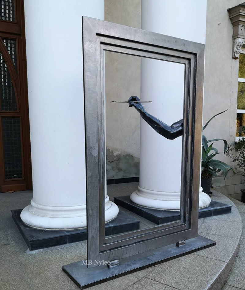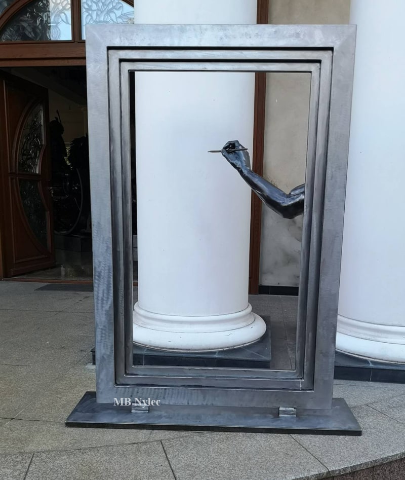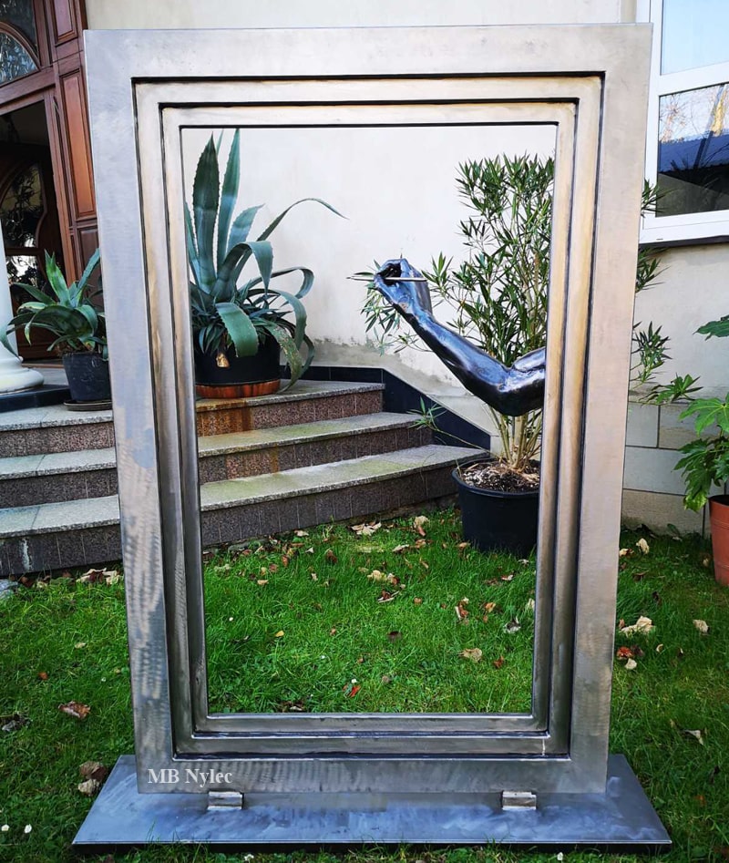 Wyjątkowa duża przestrzenna rzeźba wykonana w nowoczesnej formie. Rzeźba przedstawia rękę malującą obraz a całość zamknięta jest w pięknej geometrycznej ramie. Rzeźba ta jest bardzo duża ponieważ posiada 100cm szerokości i 150cm wysokości. Wyjątkową cechą tej rzeźby jest pozostawienie osobie oglądającej dużą dawkę wyobraźni ponieważ rzeźba ta całkowicie inaczej prezentuje się w każdym innym środowisku w jakim zostanie postawiona.